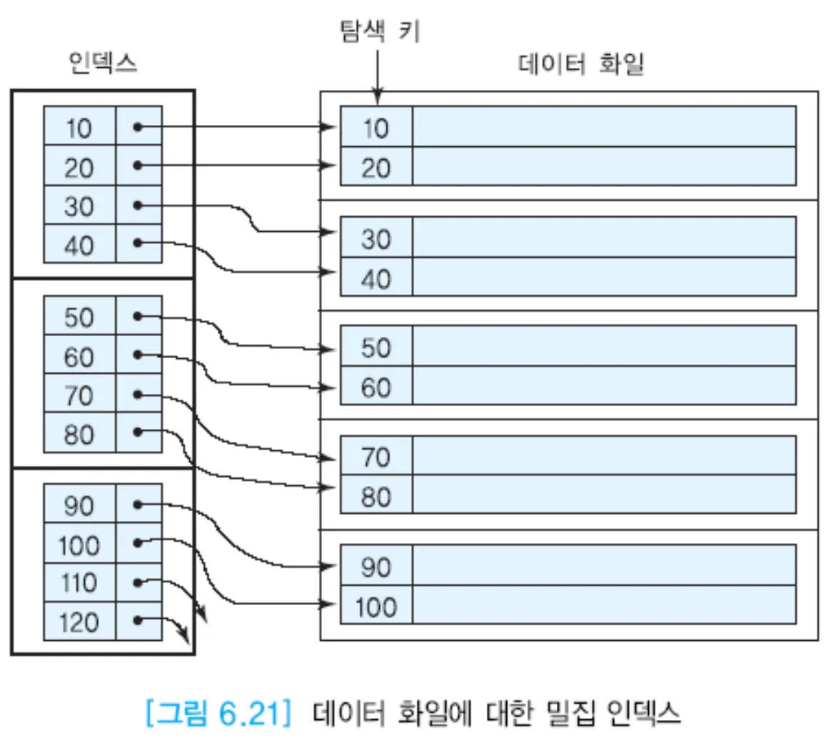 - 질의에서 인덱스가 정의된 애트리뷰트만 검색(ex. COUNT)하는 경우 → 데이터 화일을 접근할 필요 없이 인덱스만 접근해서 질의를 수행할 수 있으므로 밀집 인덱스가 희소 인덱스보다 유리