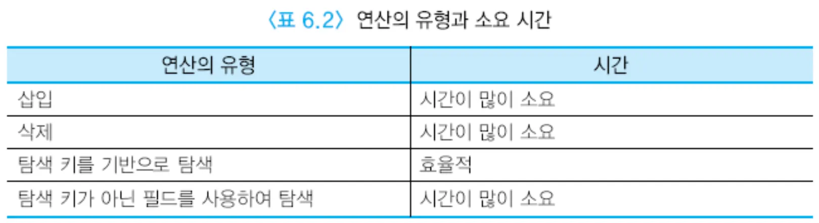 - 삽입: 삽입하려는 레코드의 순서를 고려해야 하기 때문에 시간이 많이 걸릴 수 있음