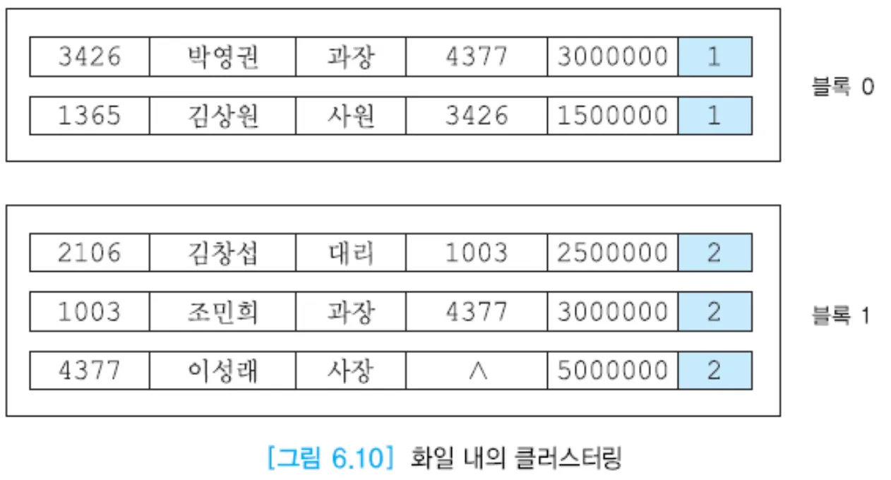 - 한 화일 내에서 함께 검색될 가능성이 높은 레코드들을 디스크 상에서 물리적으로 가까운 곳에 모아두는 것