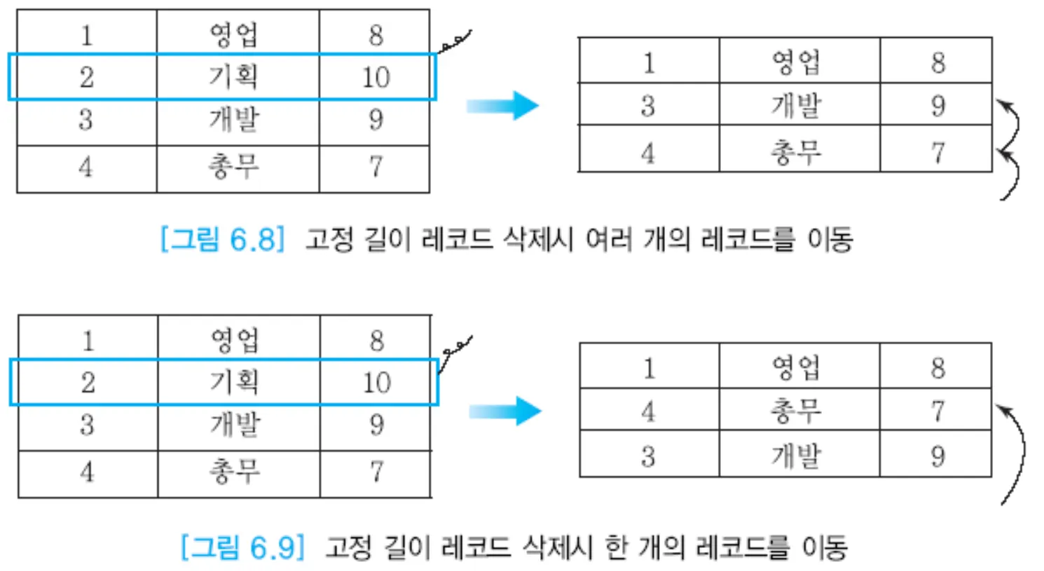 - 삭제: 원하는 레코드를 찾은 후에 그 레코드를 삭제하고, 삭제된 레코드가 차지하던 공간을 재사용하지 않음