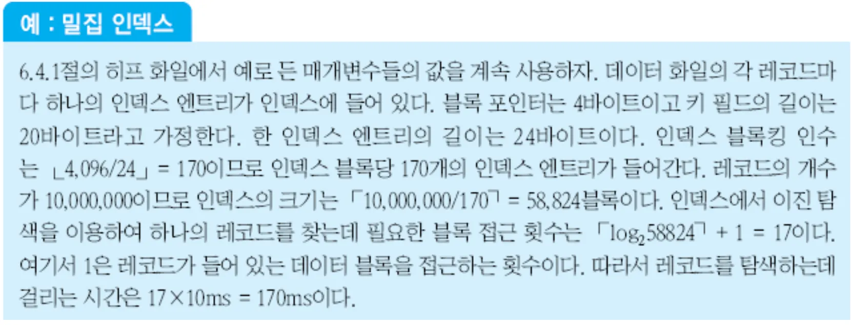 - 레코드의 길이가 블록 크기보다 훨씬 작은 일반적인 경우 → 희소 인덱스의 엔트리 수가 밀집 인덱스의 엔트리 수보다 훨씬 적음
