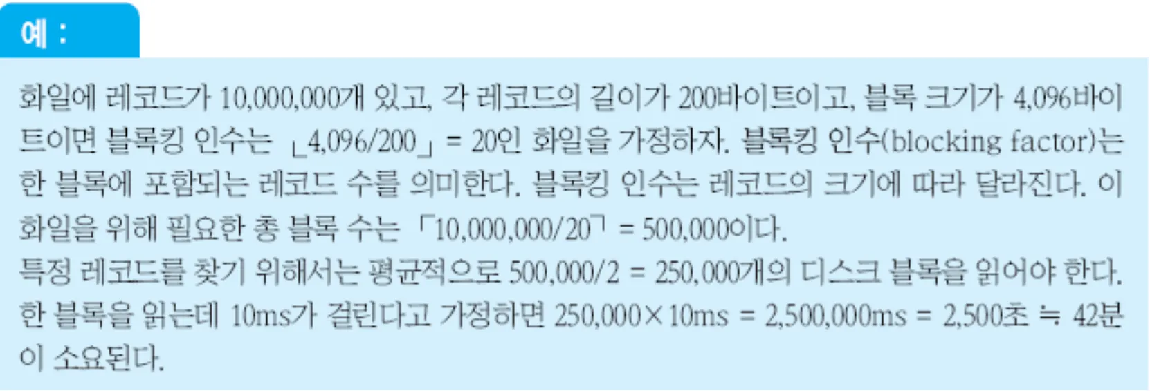 - 특정 레코드를 검색하는 경우 → b개의 블록, 원하는 블록을 찾는데 평균 b/2개의 블록 읽음 → 비효율적