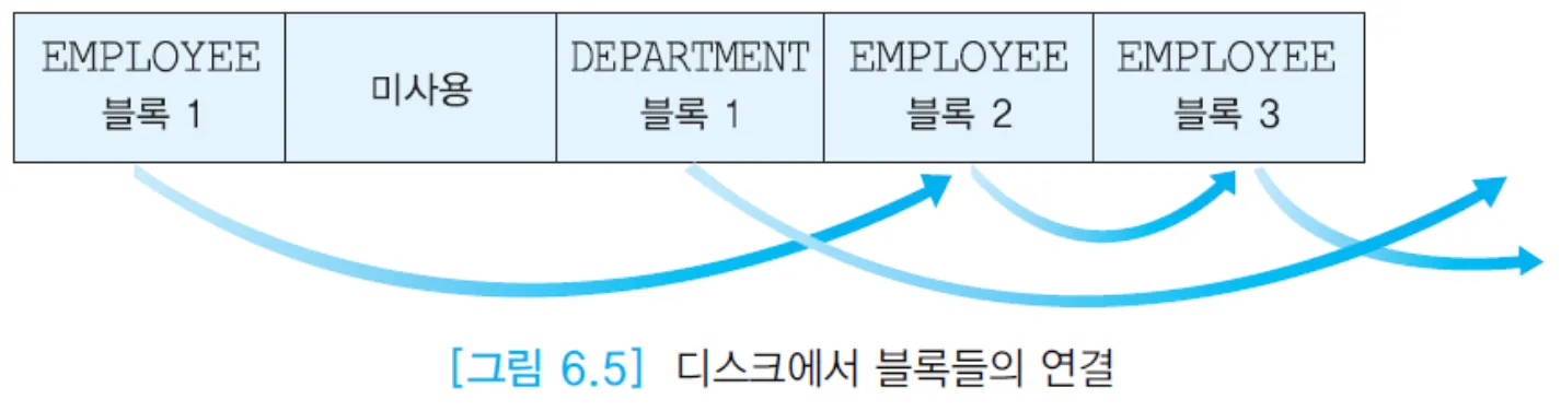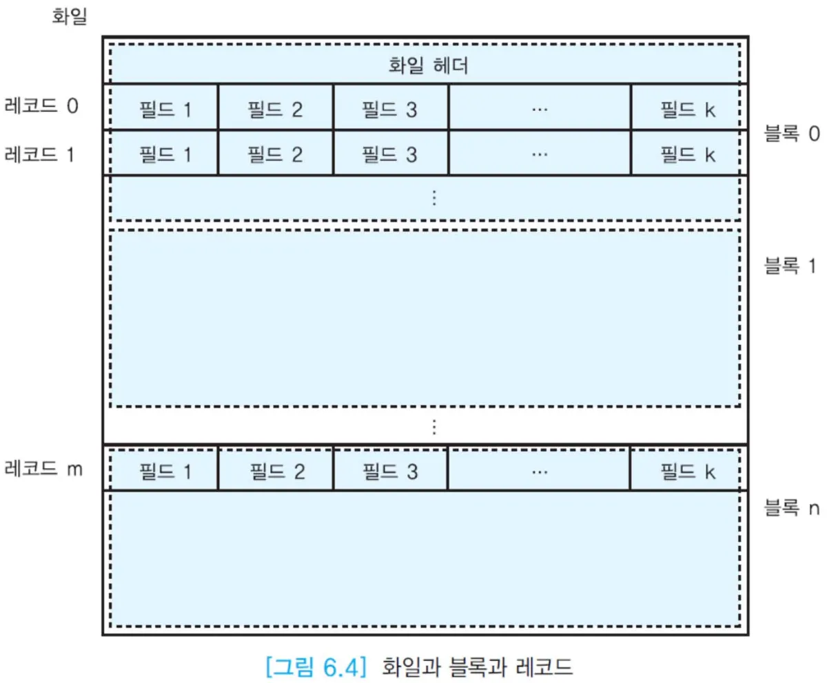 - 한 릴레이션을 구성하는 레코드들의 모임이 화일이라고 부르는 블록들의 모임에 저장