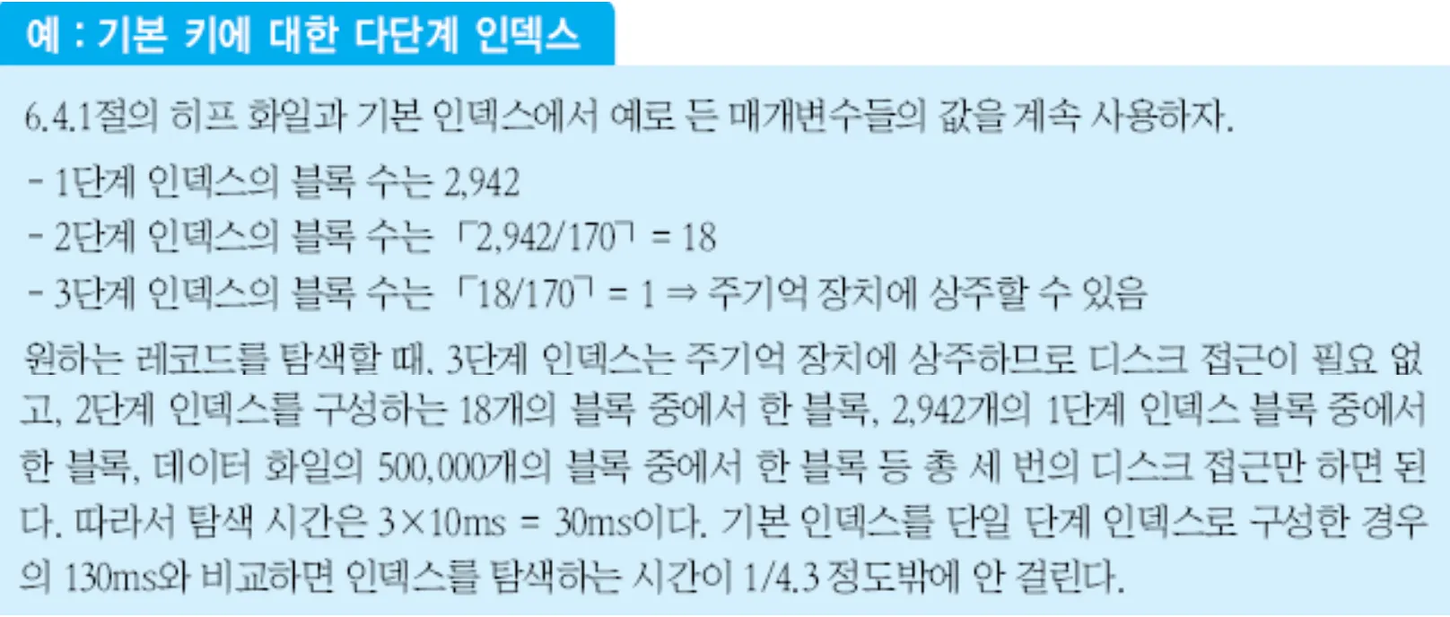 - 다단계 인덱스는 가장 상위 단계의 모든 인덱스 엔트리들이 한 블록에 들어갈 수 있을 때까지 과정 반복