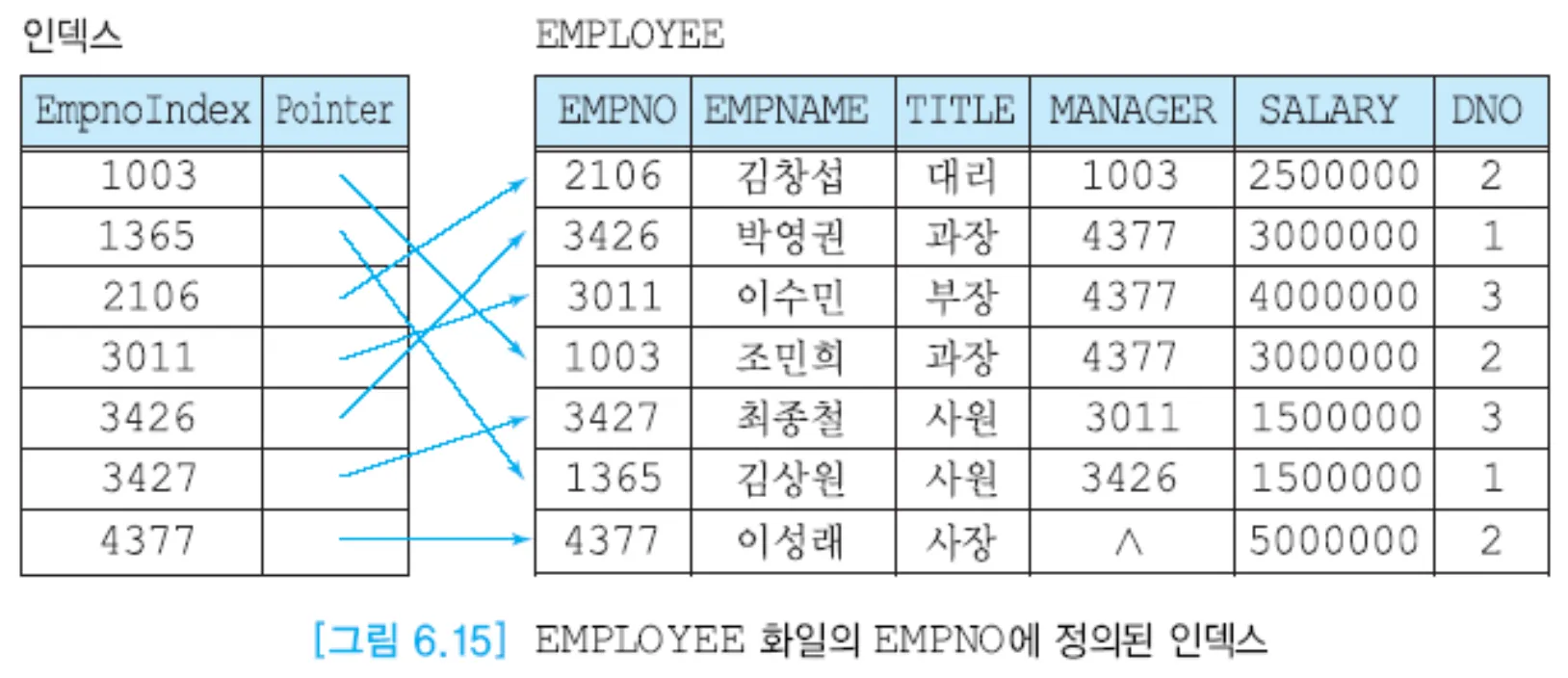 - 인덱스: 데이터 화일과는 별도의 화일에 저장