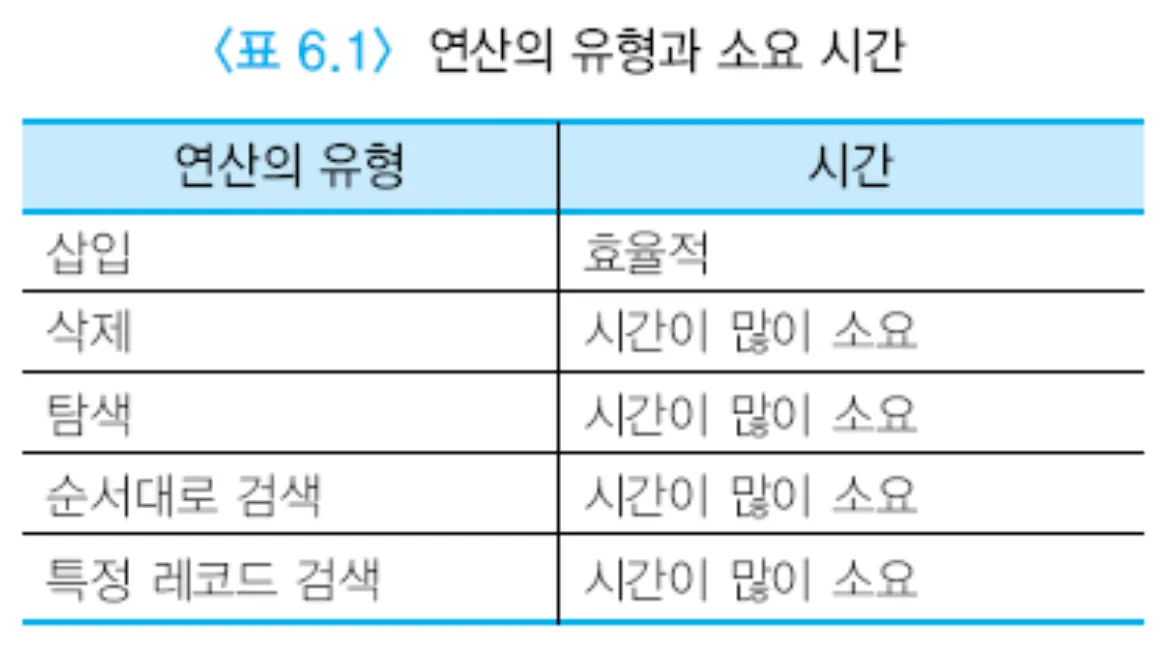 - 검색: 원하는 레코드를 찾기 위해 모든 레코드들을 순차적으로 접근해야 함