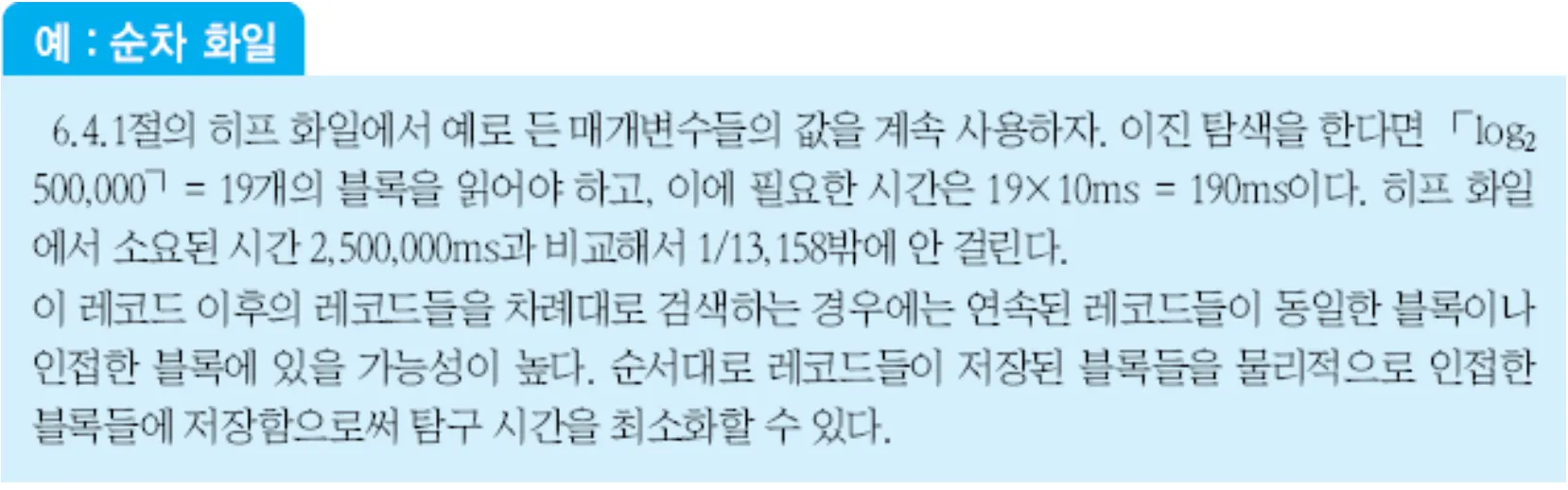 - 레코드들이 일반적으로 레코드의 탐색 키(search key) 값의 순서에 따라 저장