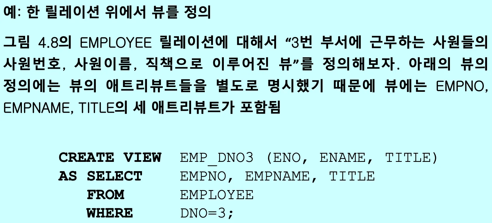 - ex. EMPLOYEE 릴레이션의 SALARY 애트리뷰트를 제외하고 뷰를 정의하면 SALARY 정보를 숨길 수 있음