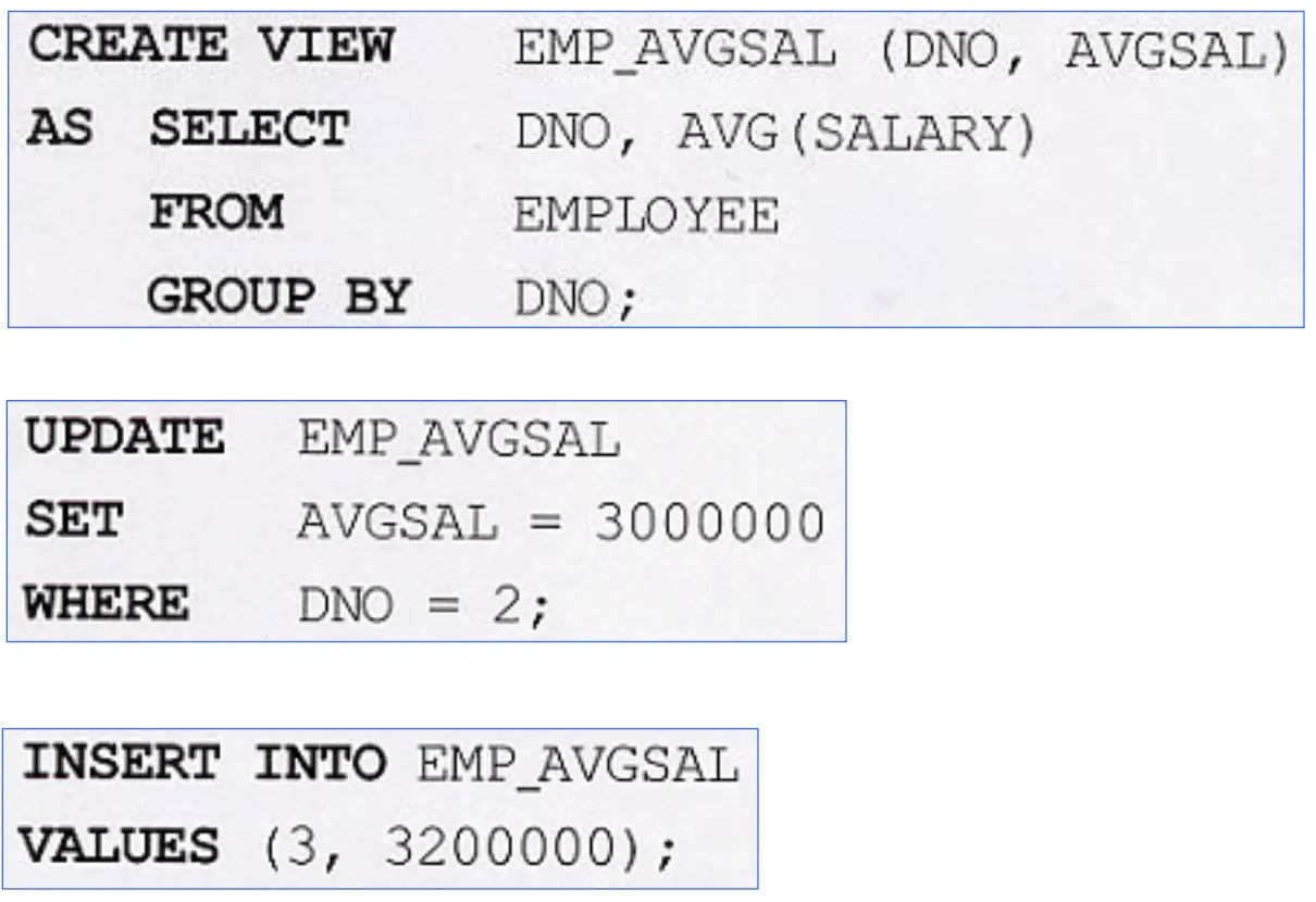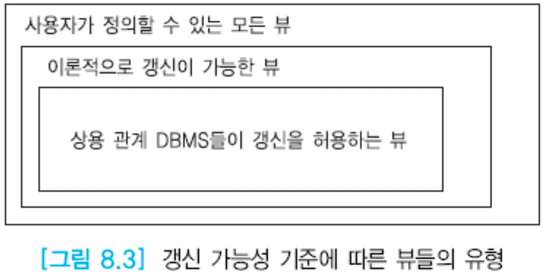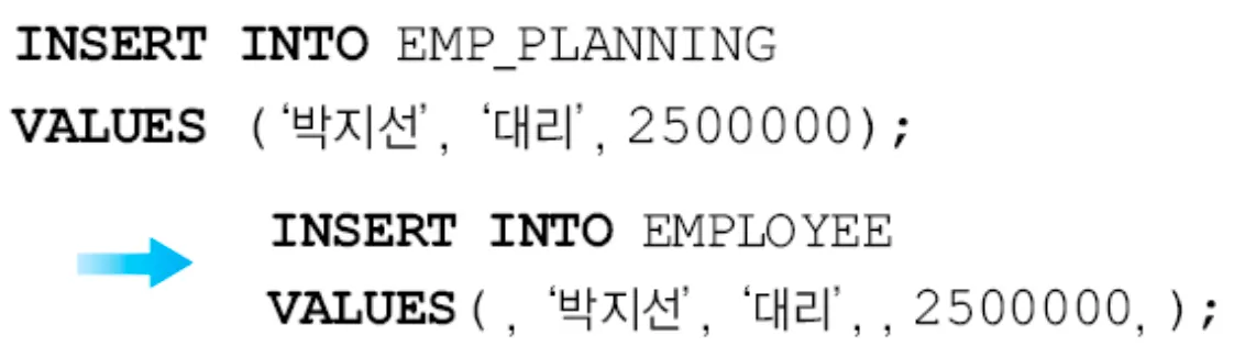 - 기본 릴레이션의 애트리뷰트들 중에서 뷰에 포함되지 않은 애트리뷰트에 대해 NOT NULL이 지정되어 있을 때