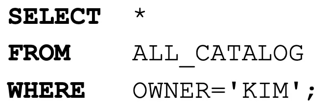 - 사용자 KIM이 소유한 테이블이나 뷰에 관한 정보를 검색하기 위해서 KIM으로 Oracle SQL Developer에 로그인을 한 후 다음과 같은 질의 수행