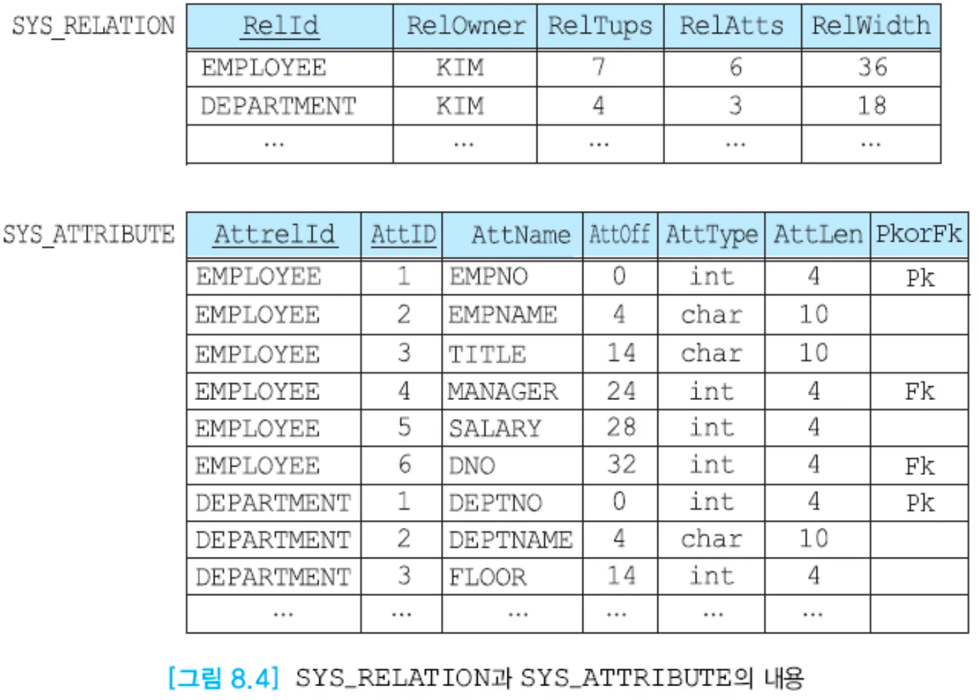 - 릴레이션, 애트리뷰트, 인덱스, 사용자, 권한 등 각 유형마다 별도의 릴레이션 유지
