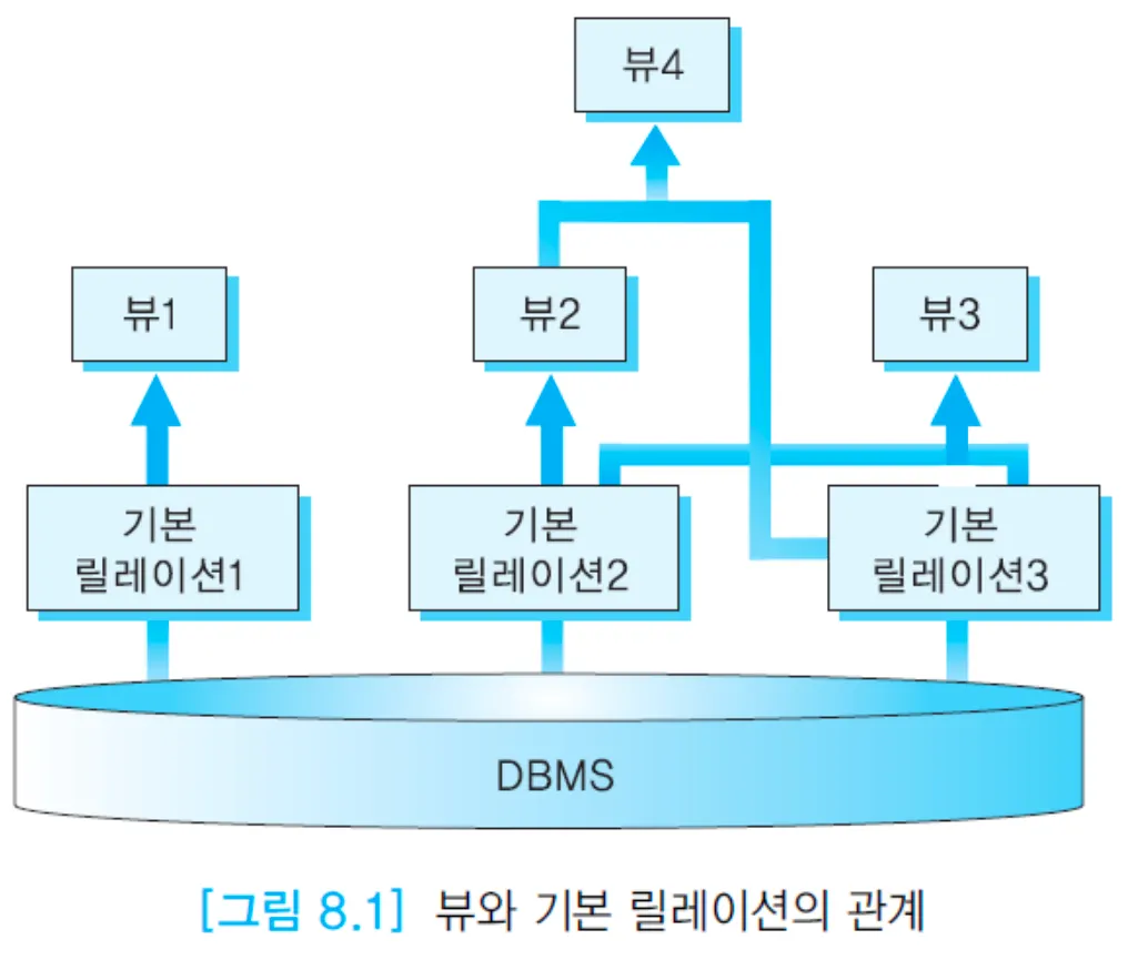 - 다른 릴레이션으로부터 유도된 릴레이션(derived relation)으로서 ANSI/SPARC 3단계 아키텍처의 외부 뷰와 다름