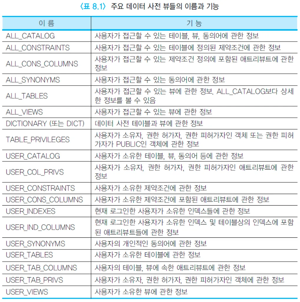 - 기본 테이블의 정보가 암호화된 형태로 저장 → 사용자가 직접 접근할 필요 거의 X → 일반적으로 이해하기 쉬운 형식의 정보를 제공하는 데이터 사전 뷰를 접근