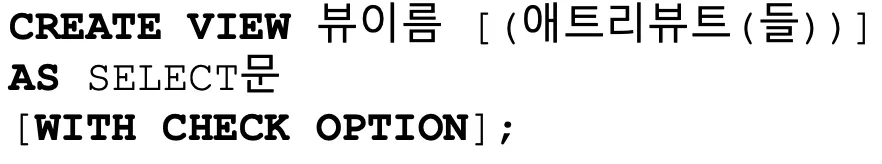 - 기존의 기본 릴레이션(base relation)에 대한 SELECT문의 형태로 정의