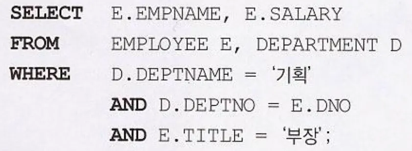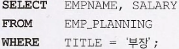 - 기획부에 근무하는 사원들 중 직책이 부장인 사원의 이름과 급여를 검색하는 질의 → 기본 릴레이션을 사용하여 표현하면 복잡한 형태의 질의