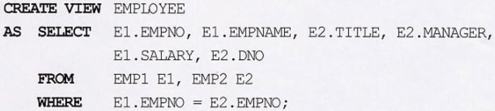 - ex. 기존 EMPLOYEE 릴레이션이 EMP1(EMPNO, EMPNAME, SALARY)과 EMP2(EMPNO, TITLE, MANAGER, DNO)로 분해 → 기존 EMPLOYEE 릴레이션을 접근하던 SELECT문은 더 이상 수행X → EMP1과 EMP2에 대한 SELECT문으로 변경