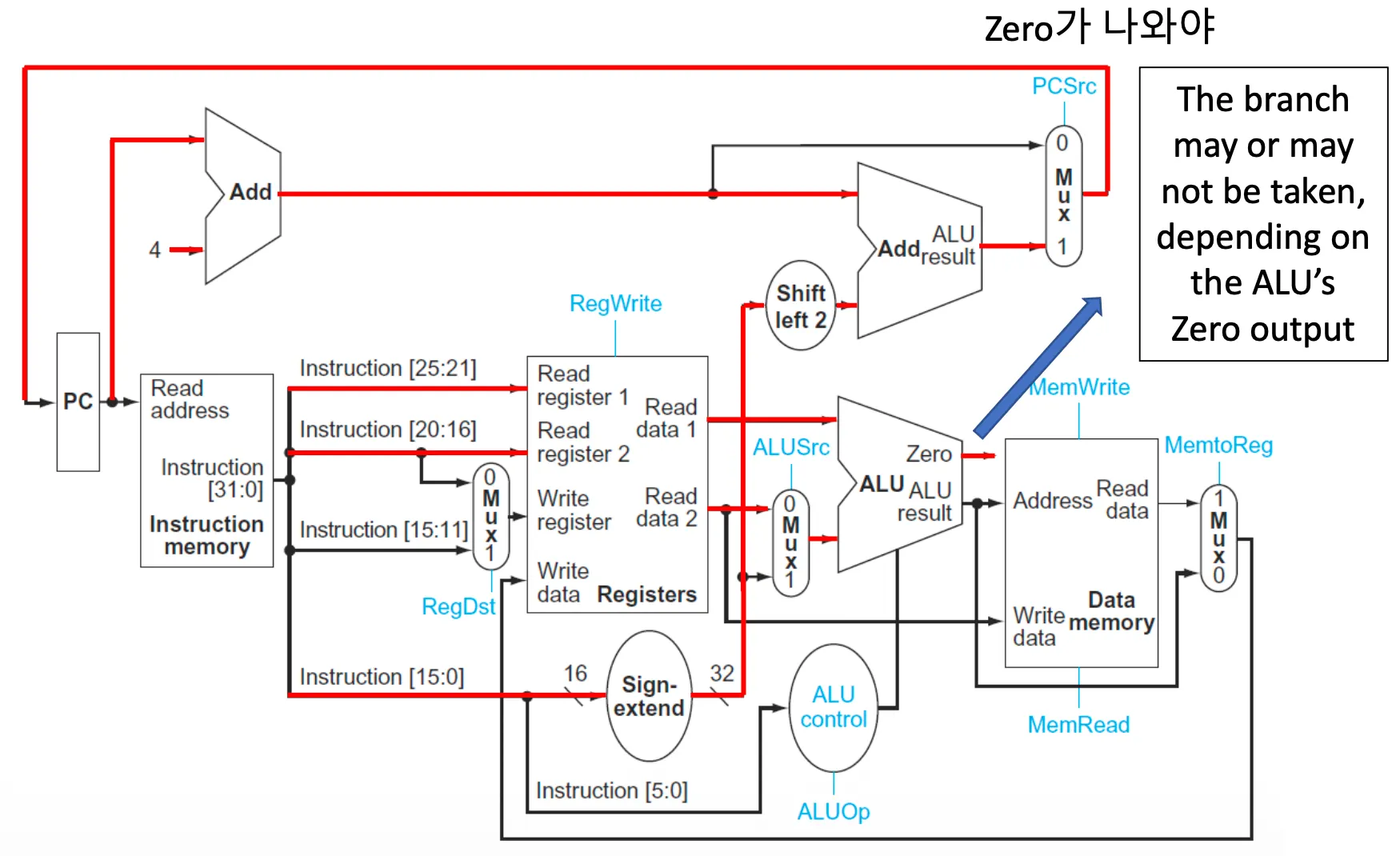 - Branch(1): PCSrc + Zero signal가 결합된 것 → Zero를 만족(1), PCSrc가 1