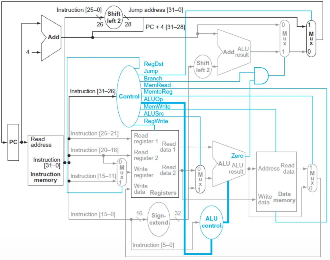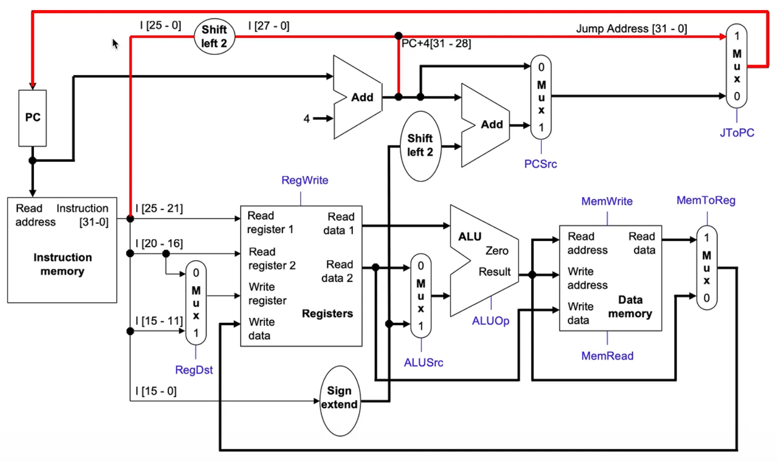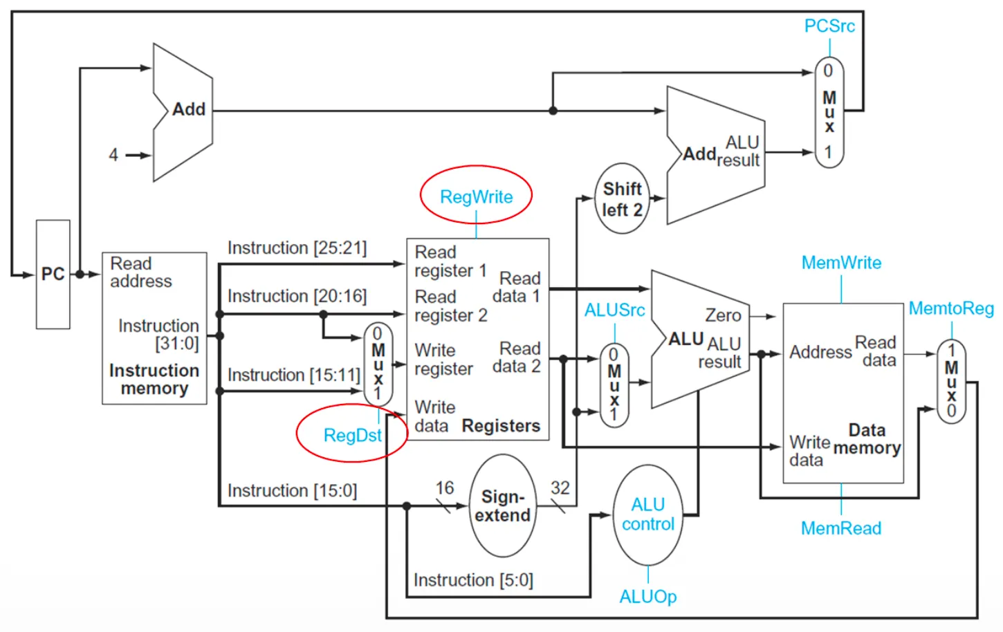 - ALUSrc(1): 인스트럭션의 const/address를 더하므로