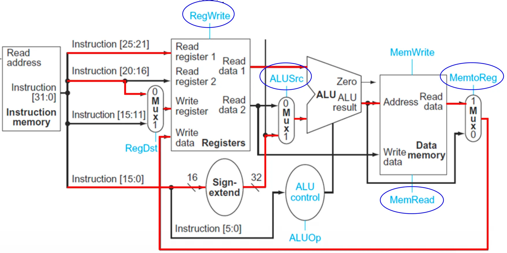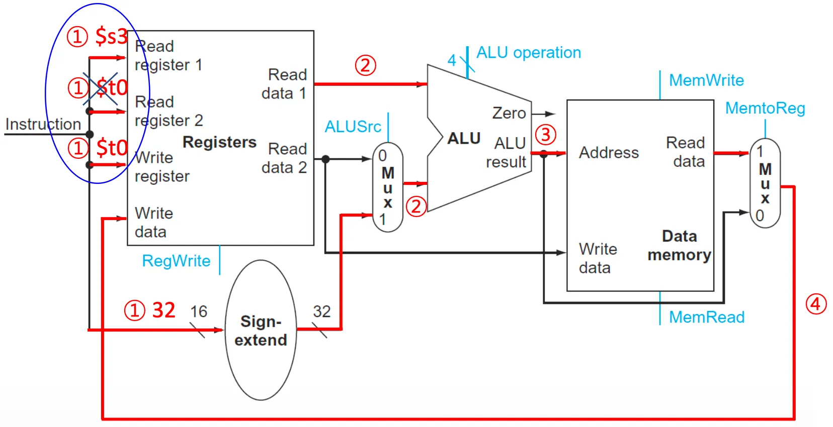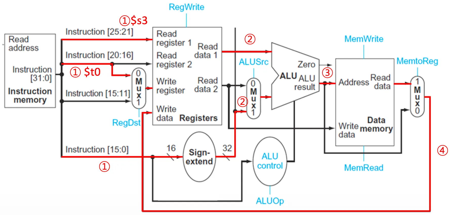 - MemtoReg(1): Data memory로부터의 데이터를 저장하므로