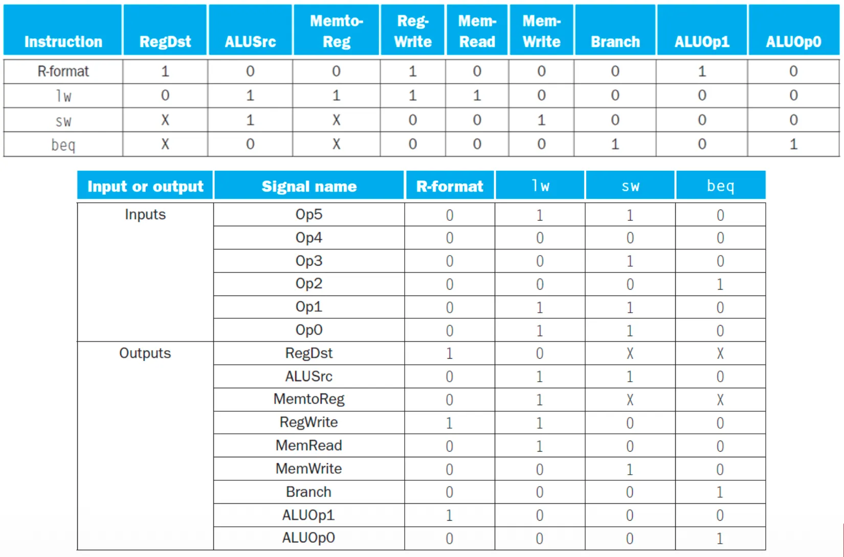 9 Control Signals(7 Signals + 2 lines ALUOp(00, 01, 10))