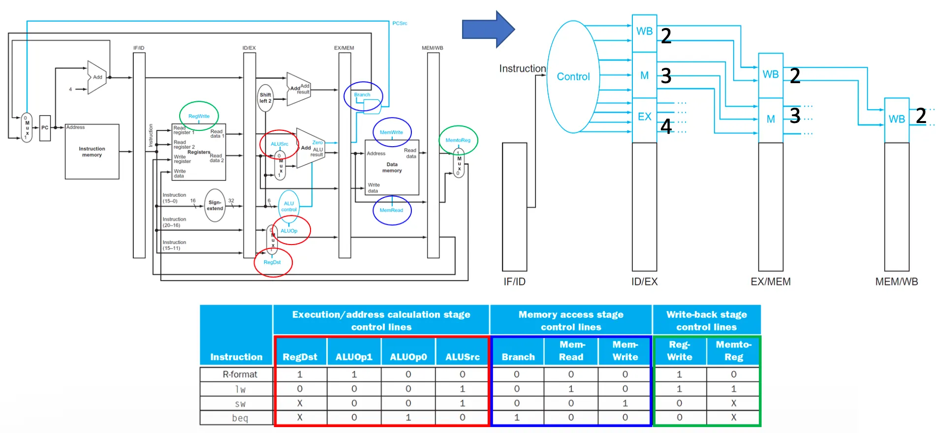 - Control signals는 EX, M, WB으로 나뉨