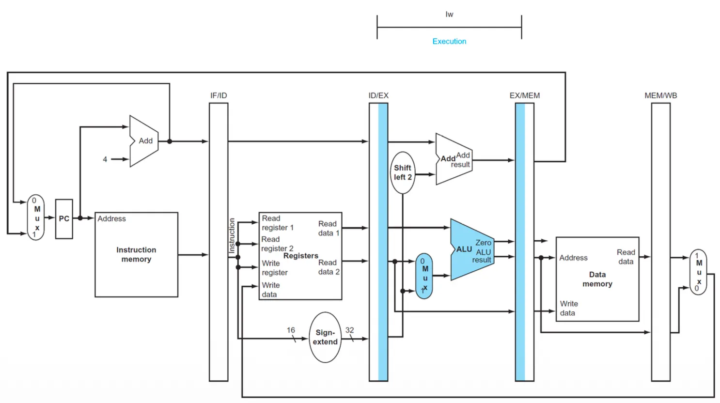 - IF/ID pipeline register에 기반하여 3개의 값을 얻음 → sign-extend 32-bits, 2개의 레지스터 데이터