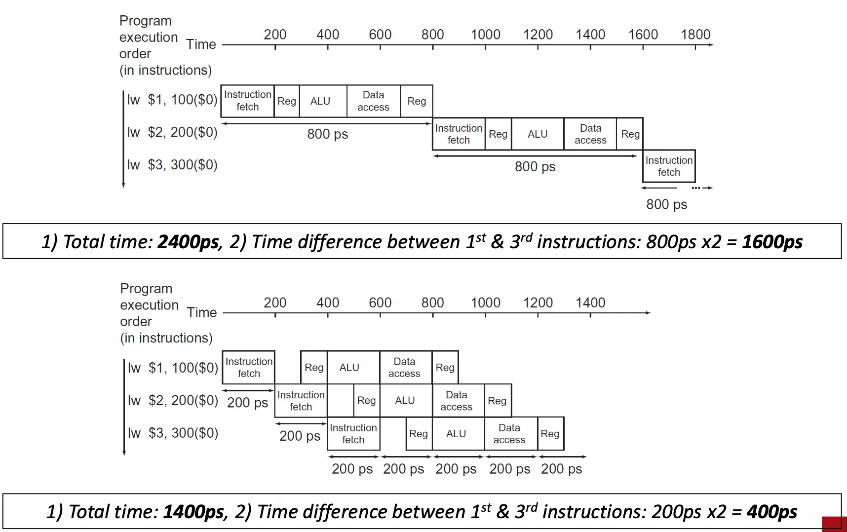 - Nonpipelined: 1,000,000 * 800ps + 2400ps ≅ 800,000,000ps