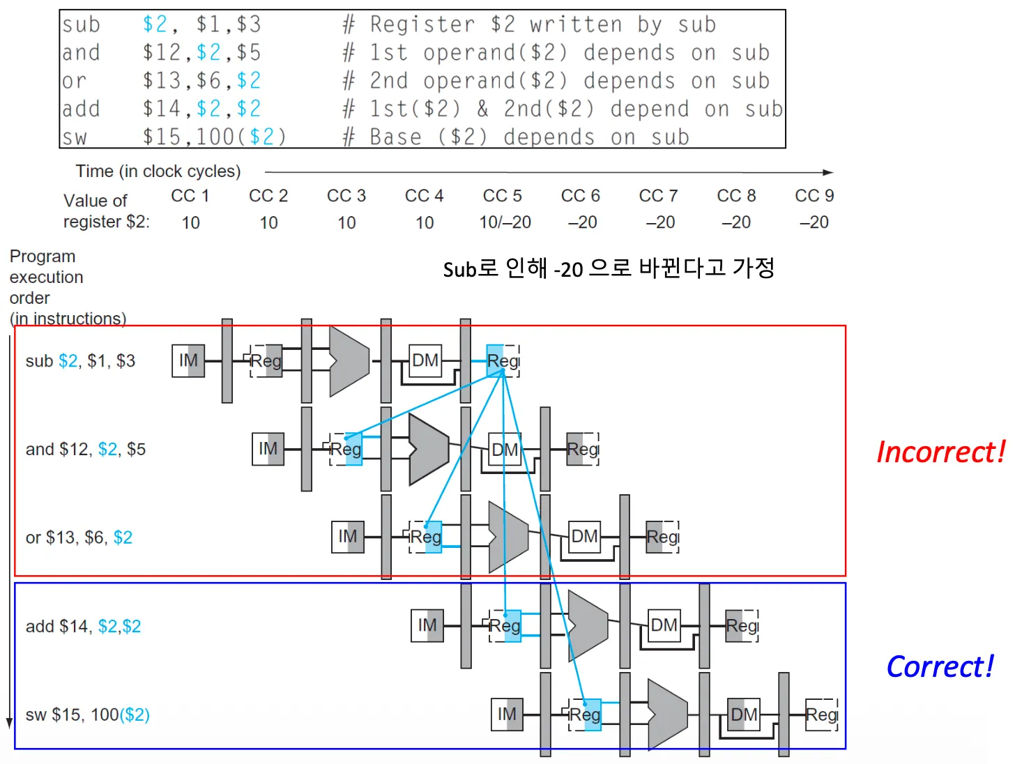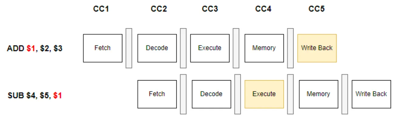 - 이전 인스트럭션의 WB이 반영되기 전에 WB에서 반영될 예정인 레지스터를 포함한 다음 인스트럭션의 EX가 실행되는 경우