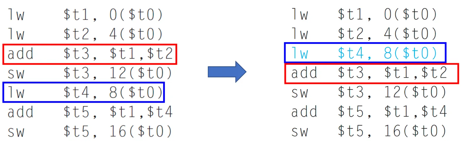 - lw의 rt를 다음 인스트럭션의 rs 또는 rt와 같은 경우 → 최대한 빨리 stall