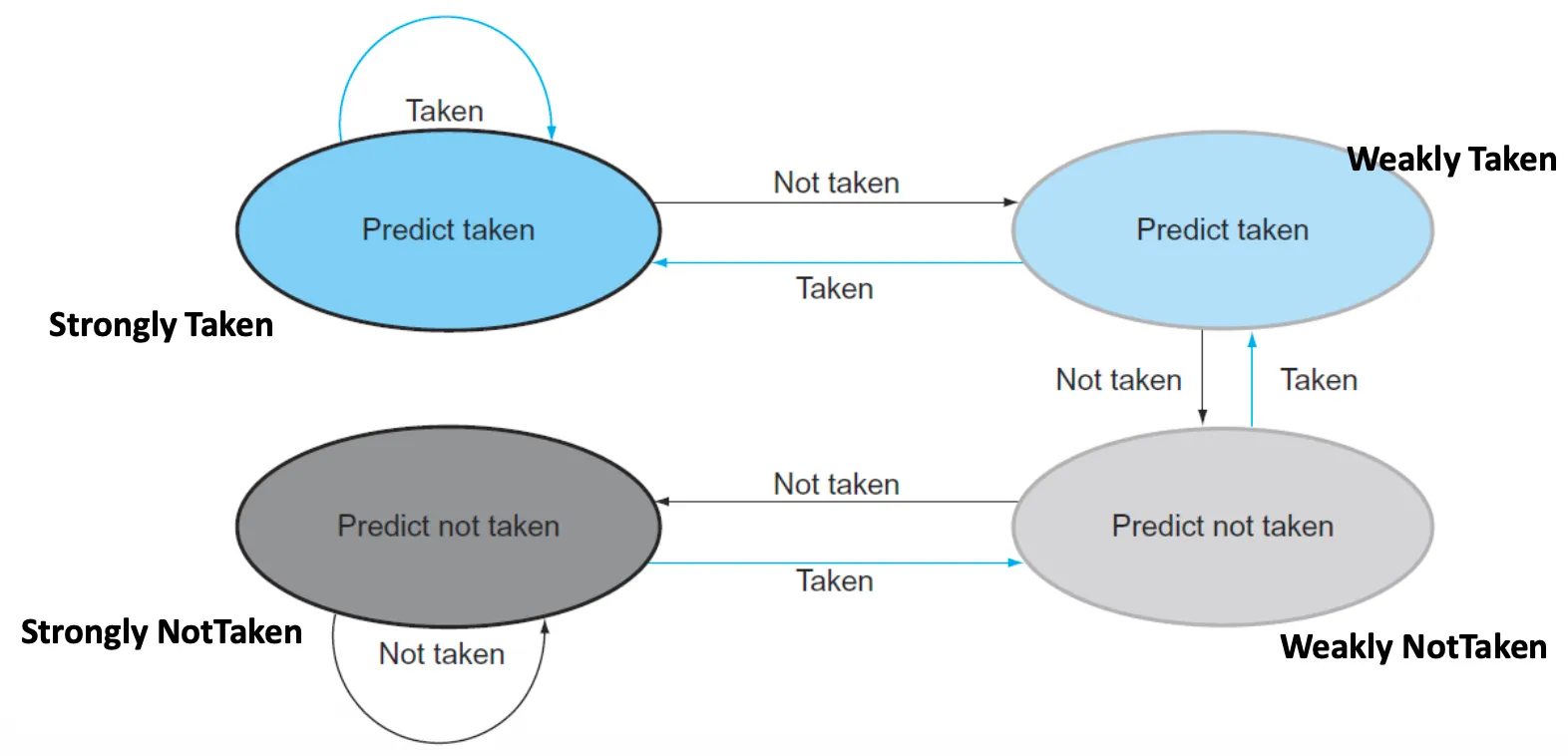 - branch prediction이 연속으로 2번 틀려야 상태 변경