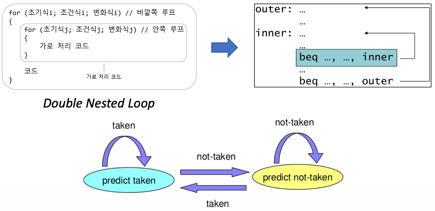 - 하지만 outer loop가 실행되어 inner loop가 다시 실행되면 branch taken(1) 해야 되는데 branch not taken(0)으로 되어 있어서 추가적인 miss 발생