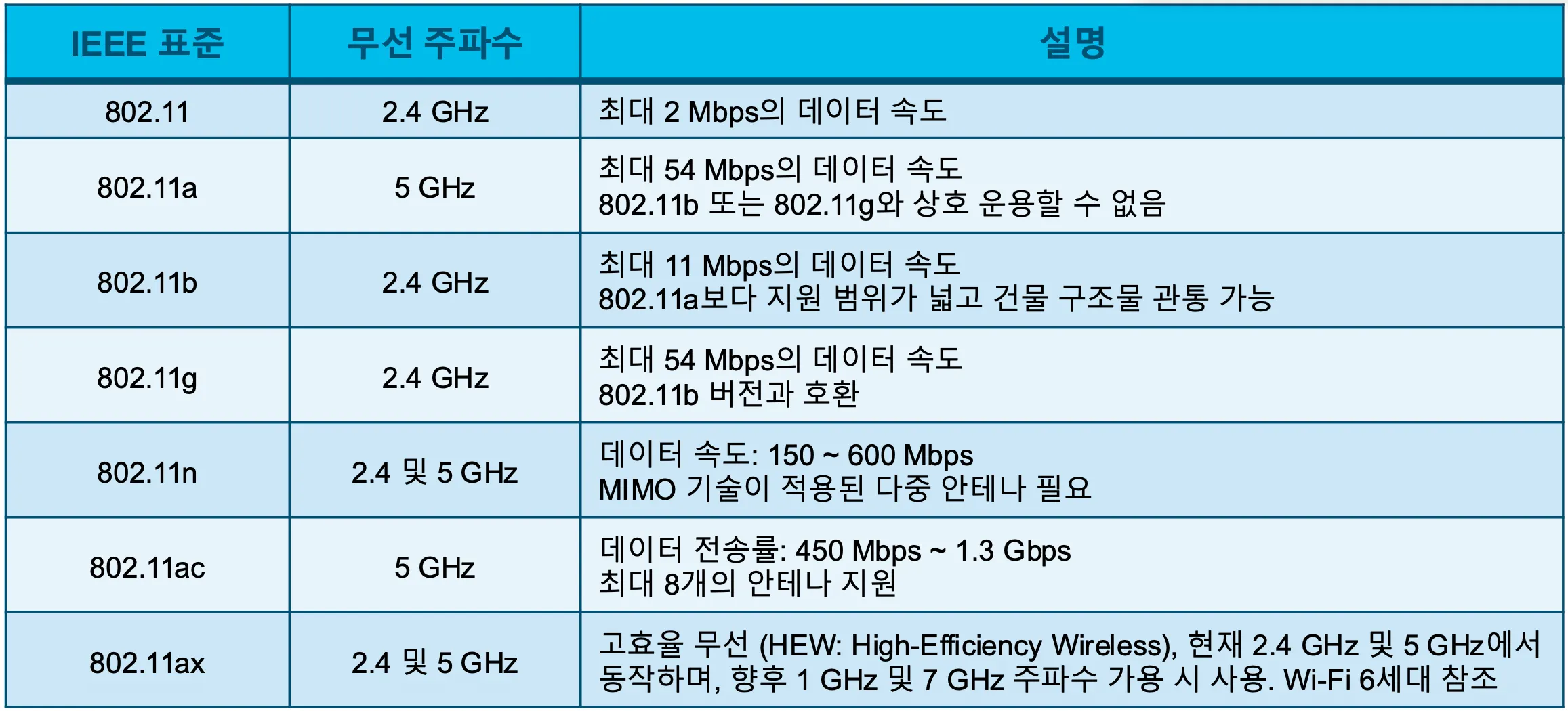 - IEE 802.11 표준 및 2.4GHz 또는 5GHz 주파수 기반