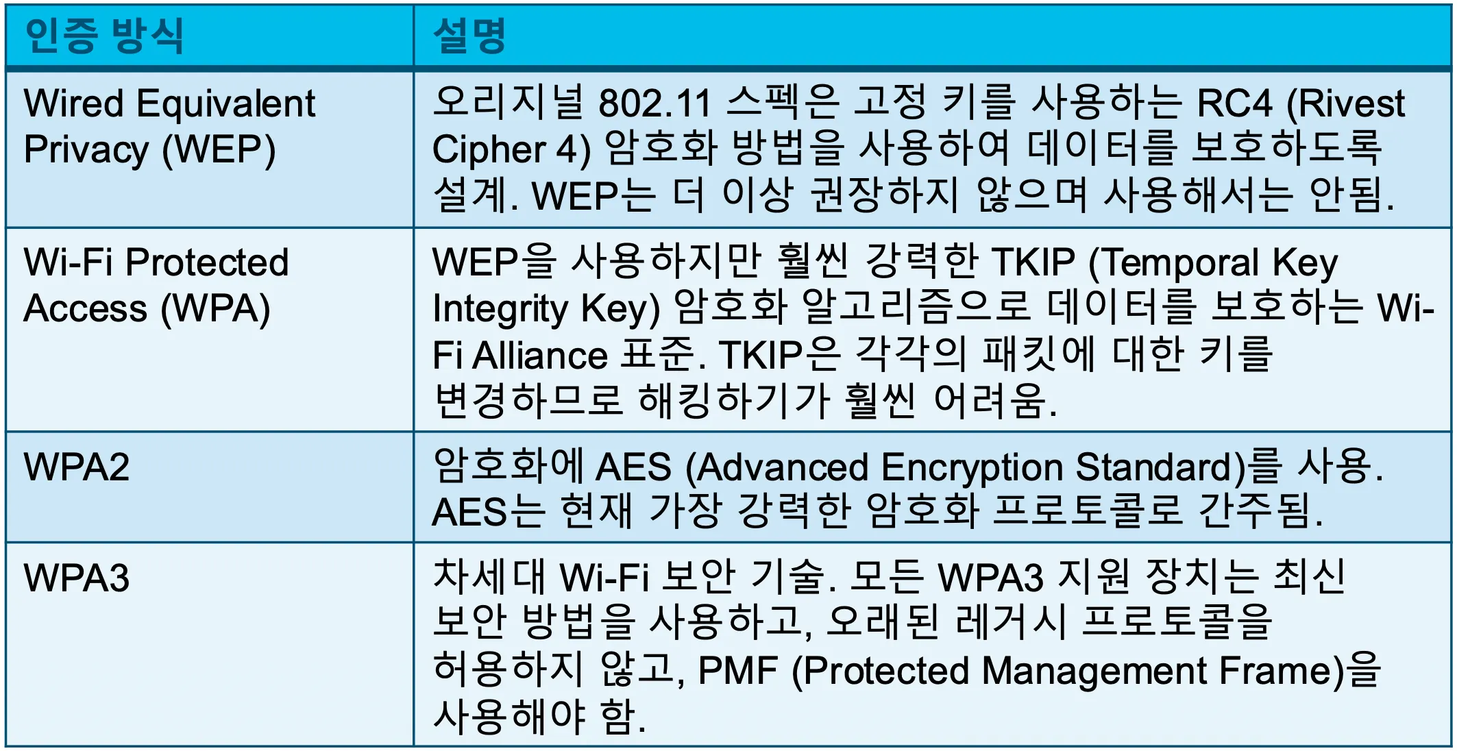 - 대응 방법: WLAN에서 합법적인 장치를 식별하도록 함(장치 및 사용자 인증)