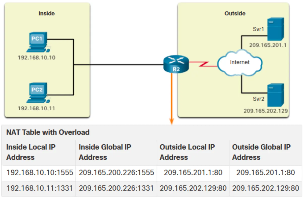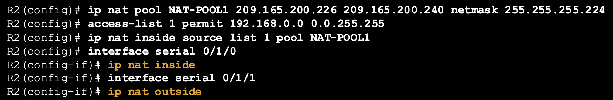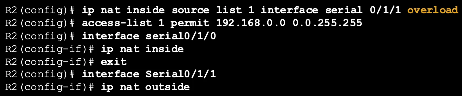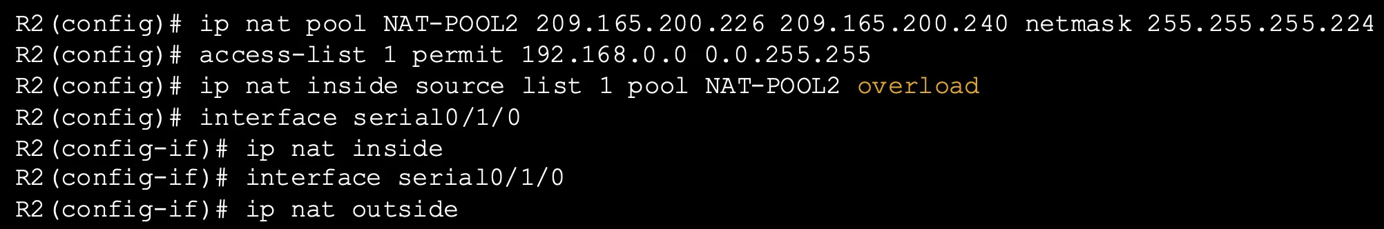 - 동적 NAT 주소 풀에 PAT를 구성하려면 ip nat inside source 명령에 overload 키워드 추가