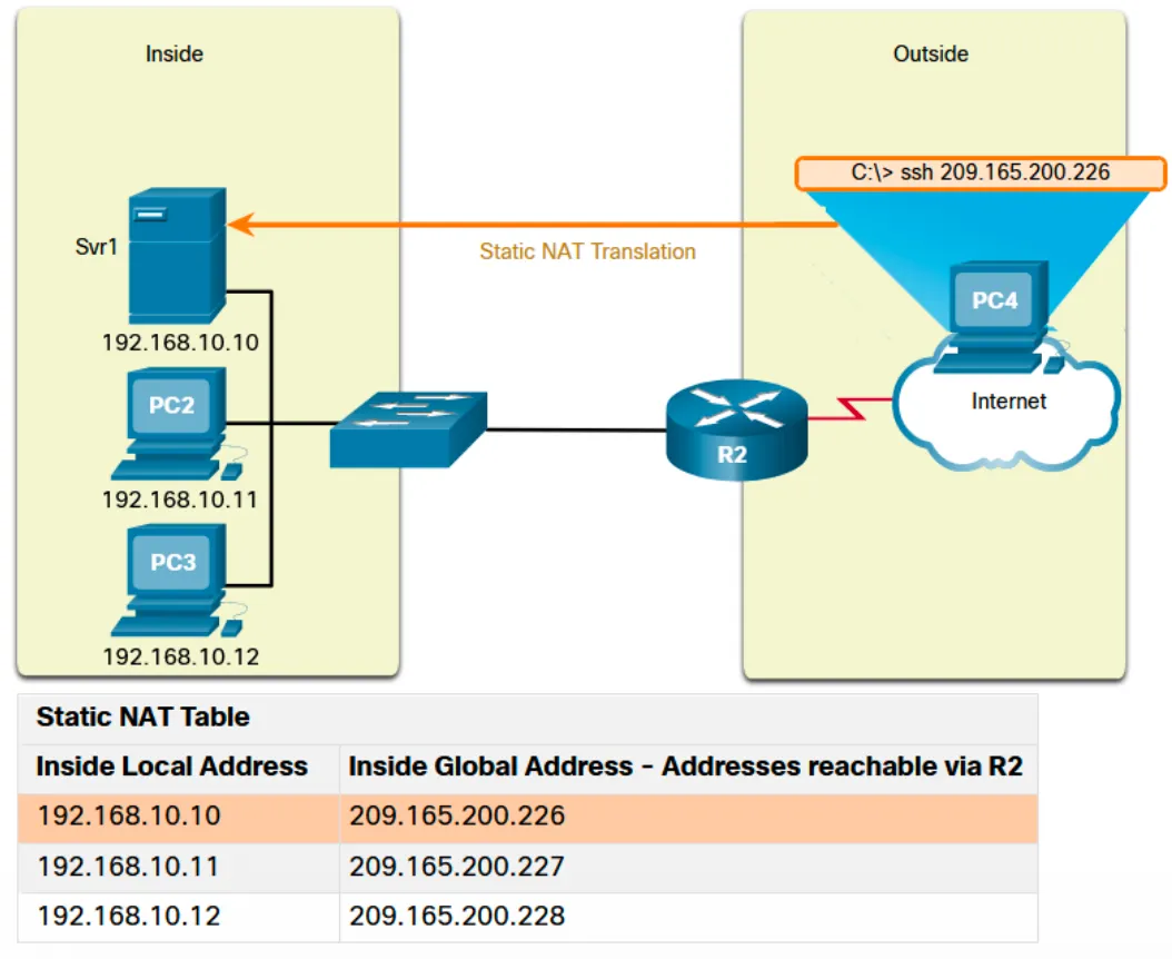 - ip nat inside source static 명령을 사용하여 내부 로컬 주소와 내부 글로벌 주소 간의 매핑 생성