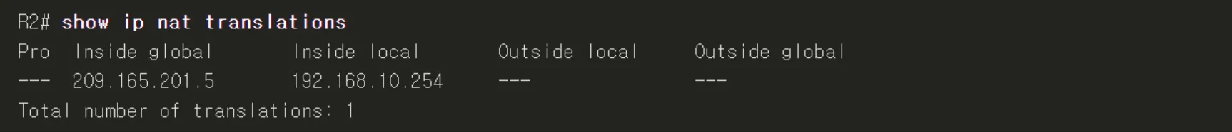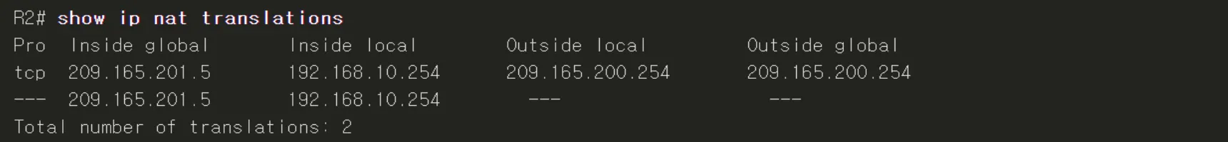 - show ip nat translation: 활성화 되어 있는 NAT 변환을 표시