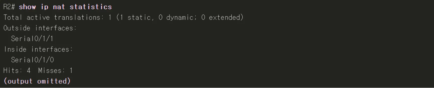 - show ip nat statistics: NAT 변환 총 수, NAT 구성 파라미터, 풀 내의 주소 수, 할당된 주소 수 등을 표시