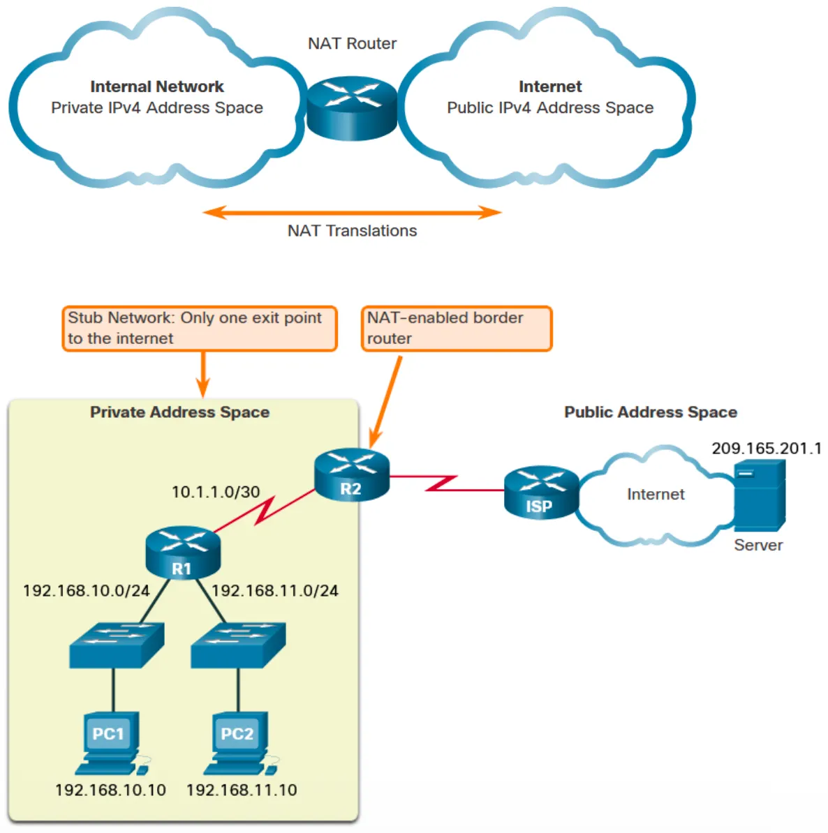 - 스터브 네트워크 내의 장치가 네트워크 외부의 장치와 통신하려는 경우 → 패킷은 NAT 프로세스를 수행하는 경계 라우터로 전달 → 장치의 내부 프라이빗 주소를 라우팅 가능한 외부 퍼블릭 주소로 변환