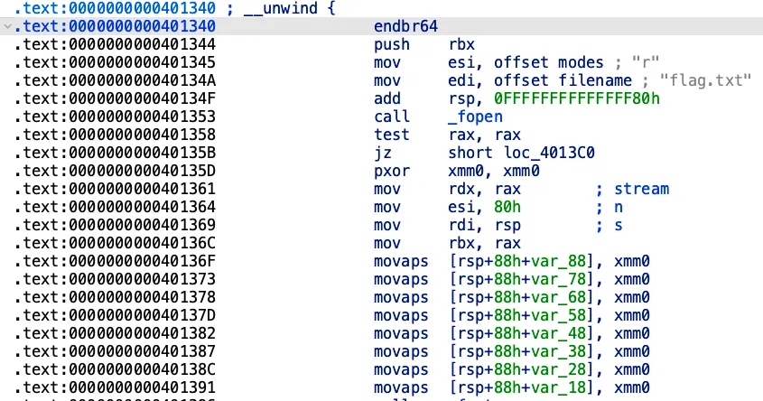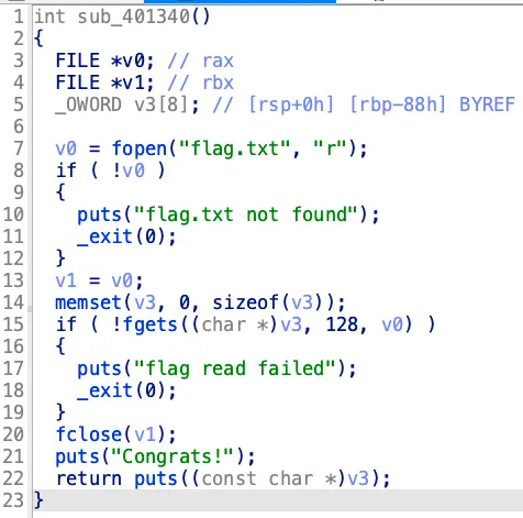 그리고 다른 함수들을 살펴보면 sub_401340가 flag를 반환하는 함수임을 알 수 있다. 따라서 return address에 0x401340을 덮어씌워줄 것이다. flag.txt 파일을 열어서 출력하는 코드이므로 flag.txt를 생성하고 임의로 flag를 입력했다.
